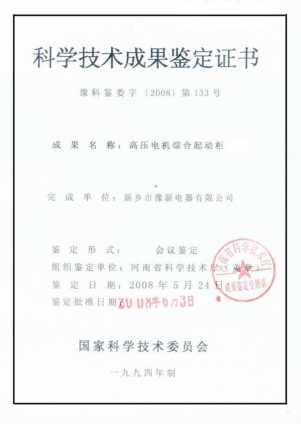 高壓電機(jī)綜合啟動(dòng)柜鑒定證書